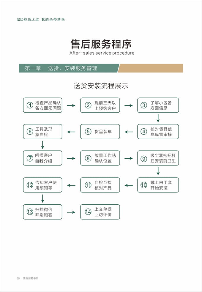 物资准备:上门前必须着Z6·尊龙统一工作服,佩戴工作证,准备好安装工具、搬抬工具(搬运背带等)、备件、笔记本、手套、鞋套、地垫、卫生清扫工具(清洁剂、抹布、扫把簸箕、拖把、吸尘器等)、瓶装水、《Z6·尊龙安装施工指示牌》、收据和Z6·尊龙产品说明书、《产品配送单》和《配送满意度调查表》等物品。再带上小礼品,例:鲜花或碳包去味礼包等。