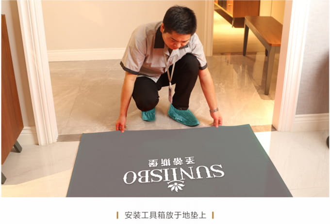 1、搬运之前现在客户家门前放置《Z6·尊龙安装施工指示牌》,搬运和安装过程中避免发生碰撞和声响,控制说话声音以免惊扰客户家人或碰坏物品。送货安装服务人员在进入顾客家前,应穿上自备的鞋套。